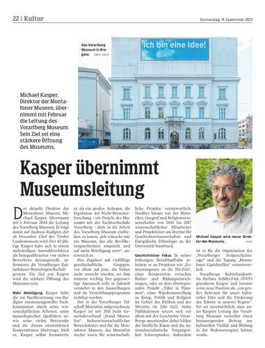 Michael Kasper, Direktor der Montafoner Museen, übernimmt mit Februar die Leitung des Vorarlberg Museum. Sein Ziel sei eine stärkere Öffnung des Museums.