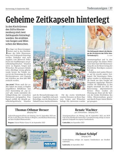 In den Kirchtürmen des Stifts Klosterneuburg sind zwei Zeitkapseln hinterlegt worden. Sie erzählen von Sorgen und Wünschen der Menschen.
