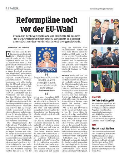 Ursula von der Leyen zog Bilanz und skizzierte die Zukunft der EU: Erweiterung bleibt Fixziel, Wirtschaft soll stärker unterstützt werden – und sie kritisiert Schengenblockade.