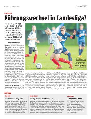 Leader FC Bizau hat heute den noch ungeschlagenen SK Meiningen zu Gast, und der in Lauerstellung liegende SC Göfis trifft zu Hause (15 Uhr) auf den FC Kennelbach.