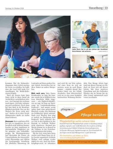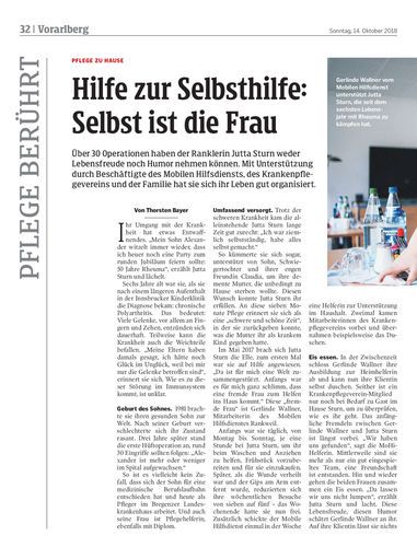 Über 30 Operationen haben der Ranklerin Jutta Sturn weder Lebensfreude noch Humor nehmen können. Mit Unterstützung durch Beschäftigte des Mobilen Hilfsdiensts, des Krankenpflegevereins und der Familie hat sie sich ihr Leben gut organisiert.