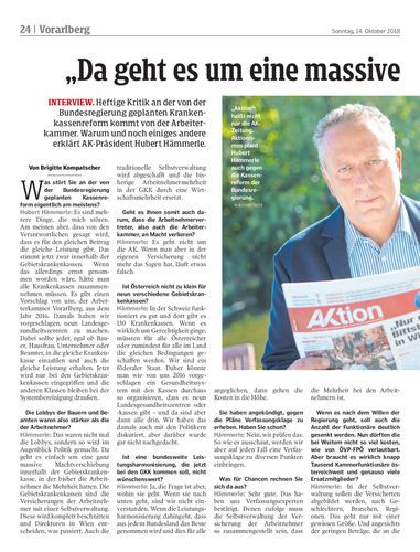 Interview. Heftige Kritik an der von der Bundesregierung geplanten Krankenkassenreform kommt von der Arbeiterkammer. Warum und noch einiges andere erklärt AK-Präsident Hubert Hämmerle.
