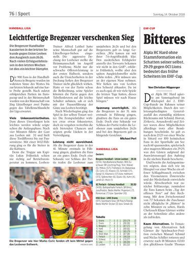 Die Bregenzer Handballer kassierten in der letzten Sekunde gegen Union Leoben den Ausgleich zum 26:26. Nach vielen Erfolgserlebnissen in den letzten Wochen ist dies ein leichter Dämpfer.