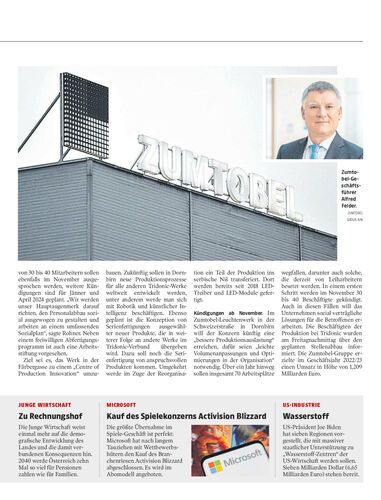 In Dornbirn sollen 70 Stellen abgebaut werden, erste Kündigungen sind für November geplant. Bei Komponententochter Tridonic sind laut Aussendung 100 Mitarbeiter betroffen.