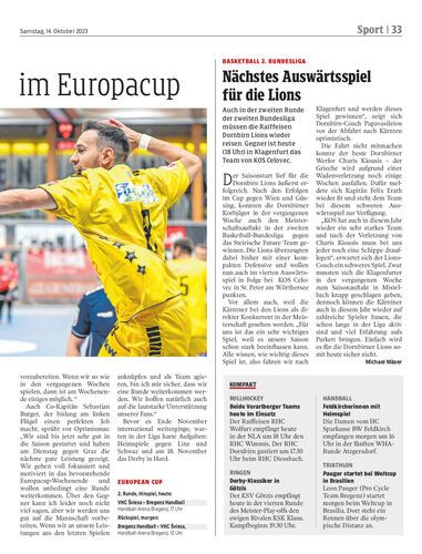Auch in der zweiten Runde der zweiten Bundesliga müssen die Raiffeisen Dornbirn Lions wieder reisen. Gegner ist heute (18 Uhr) in Klagenfurt das Team von KOS Celovec.