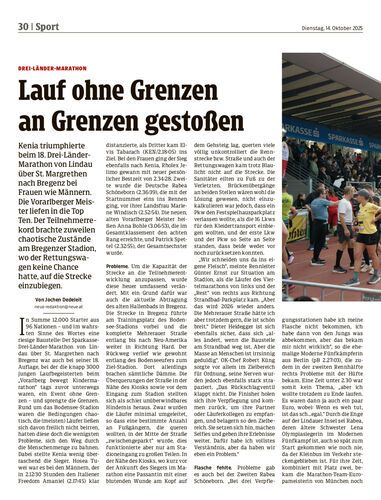 Kenia triumphierte beim 18. Drei-Länder-Marathon von Lindau über St. Margrethen nach Bregenz bei Frauen wie Männern. Die Vorarlberger Meister liefen in die Top Ten. Der Teilnehmerrekord brachte zuweilen chaotische Zustände am Bregenzer Stadion, wo der Rettungswagen keine Chance hatte, auf die Strecke einzubiegen.