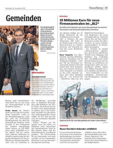 Bis 2019 soll in Nüziders ein neues Bürogebäude für Gantner Electronics und Tomaselli Gabriel Bau entstehen.