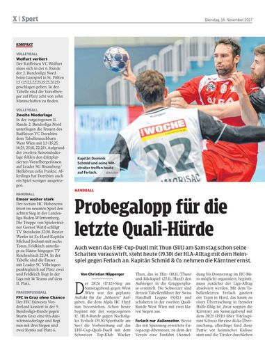 Auch wenn das EHF-Cup-Duell mit Thun (SUI) am Samstag schon seine Schatten vorauswirft, steht heute (19.30) der HLA-Alltag mit dem Heimspiel gegen Ferlach an. Kapitän Schmid & Co. nehmen die Kärntner ernst.