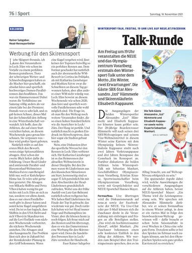 Am Freitag um 19 Uhr veranstalten die NEUE und das Olympiazentrum Vorarlberg erstmals den Wintersport-Talk unter dem Motto „Ein Winter, zwei Erwartungen“. Die Gäste: SBX-Star Alessandro „Izzi“ Hämmerle und Skirennläuferin Elisabeth Kappaurer.