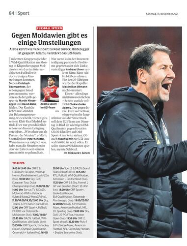 Alaba kehrt wie vereinbart zu Real zurück. Hinteregger ist gesperrt. Adamu verstärkt das U21-Team.