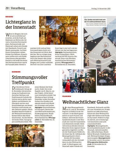 Am Samstag beginnt in Bregenz der Weihnachtsmarkt – und mit ihm die für viele Menschen schönste Zeit des Jahres. Es folgen die Adventmärkte in Dornbirn, Hohenems, Feldkirch und Bludenz. Die NEUE hat sich angeschaut, was die Städte heuer zu bieten haben.