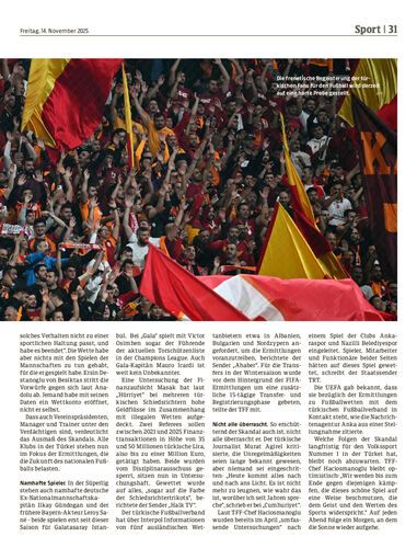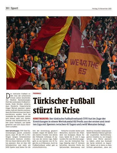 Hinetrgrund. Der türkische Fußballverband (TFF) hat im Zuge der Ermittlungen in einem Wettskandal 102 Profis aus der ersten und zweiten Liga mit Sperren zwischen 45 Tagen und zwölf Monaten belegt.