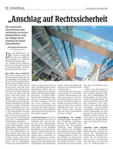 Die angedachte rückwirkende Konvertierung von Immobilienkrediten sorgt für völliges Unverständnis bei Vorarlbergs Banken.