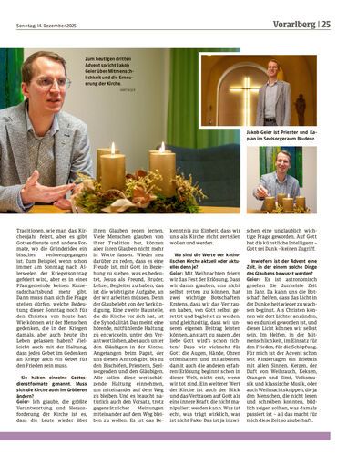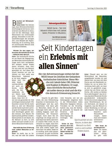 Die vier Adventsonntage stehen bei der NEUE heuer im Zeichen der Gedanken katholischer Geistlicher. Diese Woche mit Jakob Geier (30), Priester und Kaplan in Bludenz. Er sagt, dass kirchliche Botschaften aktueller denn je sind und die Kirche dennoch Erneuerung braucht.