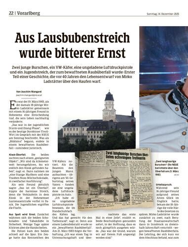 Zwei junge Burschen, ein VW-Käfer, eine ungeladene Luftdruckpistole und ein Jugendstreich, der zum bewaffneten Raubüberfall wurde: Erster Teil einer Geschichte, die vor 40 Jahren den Lebensentwurf von Mirko Ladstätter über den Haufen warf.
