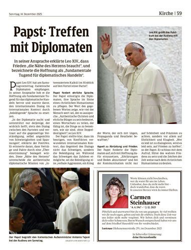 In seiner Ansprache erklärte Leo XIV., dass Frieden „die Nähe des Herzens braucht“, und bezeichnete die Hoffnung als „fundamentale Tugend für diplomatisches Handeln“.