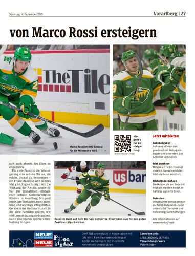 Eine besondere Gelegenheit für alle Eishockeyfans: Die NEUE versteigert ein von Marco Rossi handsigniertes Trikot zugunsten der NEUE-Patenkinder. Mitbieten ist ab sofort bis 7. Jänner möglich – wer das begehrte Stück haben möchte, sollte nicht lange warten.
