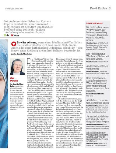 Es wäre seltsam, wenn einer Muslima im öffentlichen Dienst das verboten wird, was einem Sikh, einem Juden oder einer katholischen Ordensfrau erlaubt ist – das Tragen einer Kleidung, die in ihrer Religion begründet ist. Von Sr. Beatrix Mayrhofer