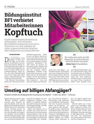 EuGH erlaubt Kopftuchverbot am Arbeitsplatz. Das steirische Berufsförderungsinstitut prescht in Österreich vor und verbannt ab sofort augenscheinliche Symbole aller Religionen aus seinem Betrieb.
