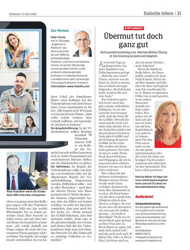 Achtsamkeitstraining von, Patrizia Böhler, Übung 21. Ein Einstieg ist jederzeit möglich.