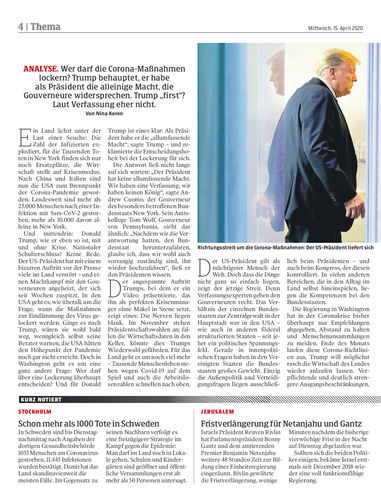 ANALYSE. Wer darf die Corona-Maßnahmen lockern? Trump behauptet, er habe als Präsident die alleinige Macht, die Gouverneure widersprechen. Trump „first“? Laut Verfassung eher nicht. Von Nina Koren
