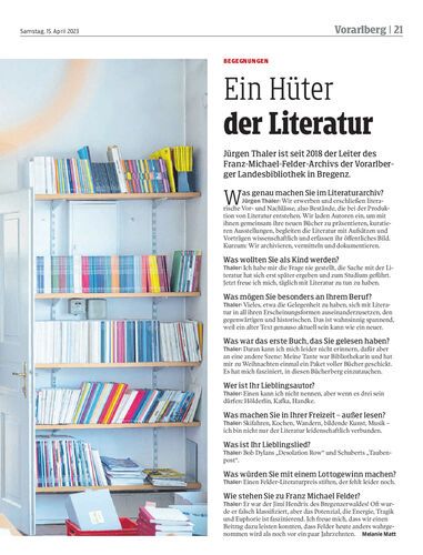 Jürgen Thaler ist seit 2018 der Leiter des Franz-Michael-Felder-Archivs der Vorarlberger Landesbibliothek in Bregenz.