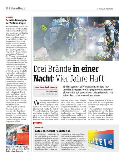 43-Jähriger mit elf Vorstrafen zündete laut Urteil in Bregenz zwei Altpapiercontainer und einen Müllsack an und versuchte danach, sich seiner Festnahme zu widersetzen.