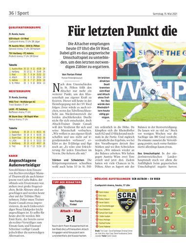 Die Altacher empfangen heute (17 Uhr) die SV Ried. Dabei gilt es das gegnerische Umschaltspiel zu unterbinden, um den letzten notwendigen Zähler zu ergattern.