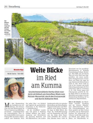 Geschichtenerzählerin Hertha Glück wanderte ab Koblach am Grenzfluss Rhein zum Plättele-Wasserfall, durch den Frutzauwald und durchs Koblacher Ried.