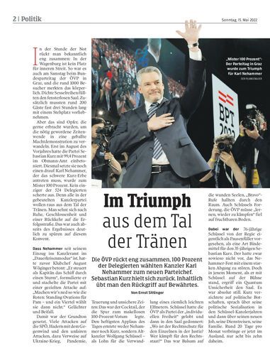 Die ÖVP rückt eng zusammen, 100 Prozent der Delegierten wählten Kanzler Karl Nehammer zum neuen Parteichef. Sebastian Kurz hielt sich zurück. Inhaltlich übt man den Rückgriff auf Bewährtes. Von Ernst Sittinger