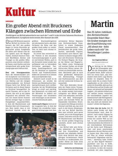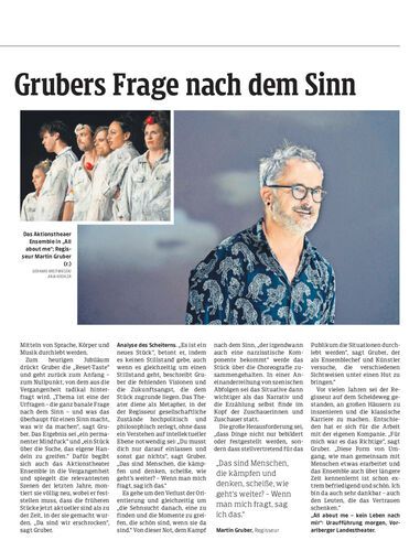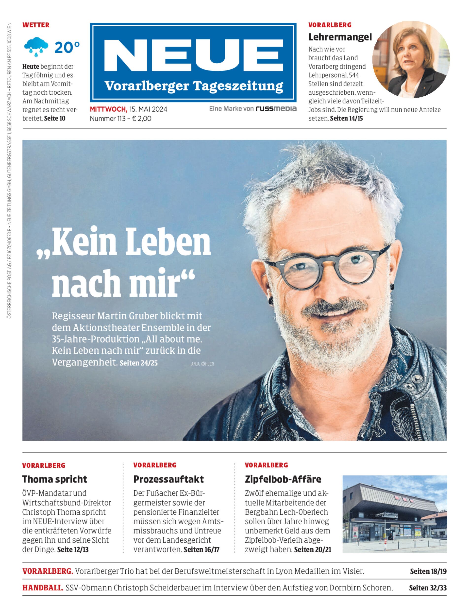 Das 35-Jahre-Jubiläum des Aktionstheater Ensemble feiert Martin Gruber morgen mit der Uraufführung von „All about me - kein Leben nach mir“ im Vorarlberger Landestheater.