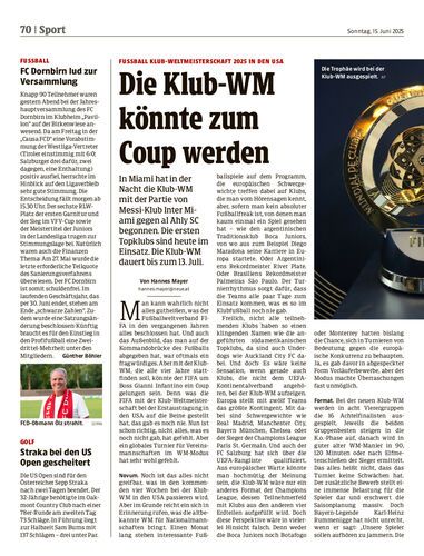 In Miami hat in der Nacht die Klub-WM mit der Partie von Messi-Klub Inter Miami gegen al Ahly SC begonnen. Die ersten Topklubs sind heute im Einsatz. Die Klub-WM dauert bis zum 13. Juli.