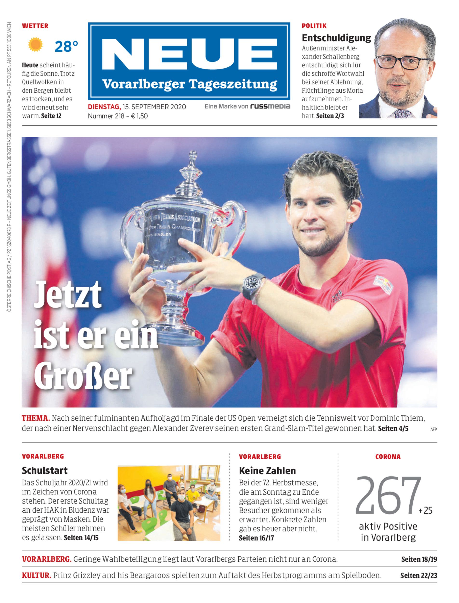 Thema. Nach seiner fulminanten Aufholjagd im Finale der US Open verneigt sich die Tenniswelt vor Dominic Thiem, der nach einer Nervenschlacht gegen Alexander Zverev seinen ersten Grand-Slam-Titel gewonnen hat. Seiten 4/5 AFP