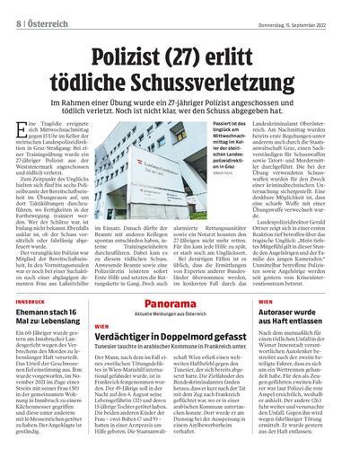 Im Rahmen einer Übung wurde ein 27-jähriger Polizist angeschossen und tödlich verletzt. Noch ist nicht klar, wer den Schuss abgegeben hat.
