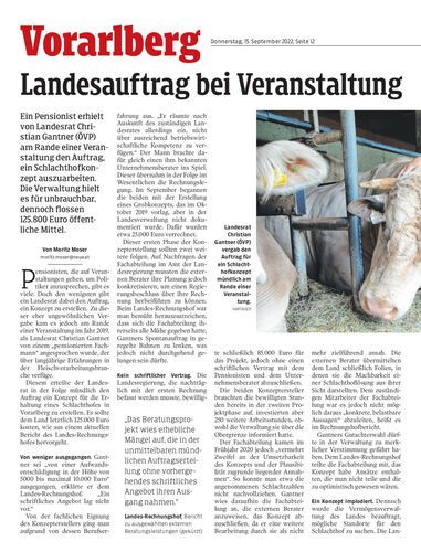 Ein Pensionist erhielt von Landesrat Christian Gantner (ÖVP) am Rande einer Veranstaltung den Auftrag, ein Schlachthofkonzept auszuarbeiten. Die Verwaltung hielt es für unbrauchbar, dennoch flossen 125.800 Euro öffentliche Mittel.