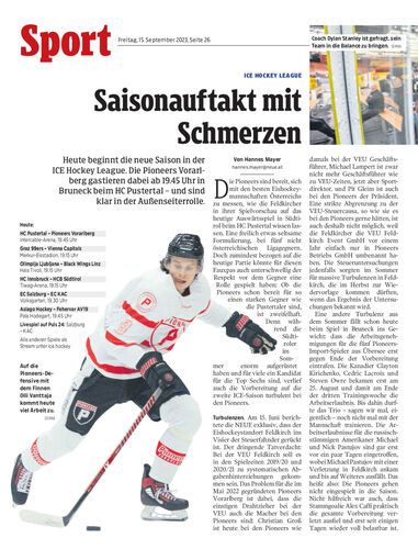 Heute beginnt die neue Saison in der ICE Hockey League. Die Pioneers Vorarl-berg gastieren dabei ab 19.45 Uhr in Bruneck beim HC Pustertal – und sind klar in der Außenseiterrolle.