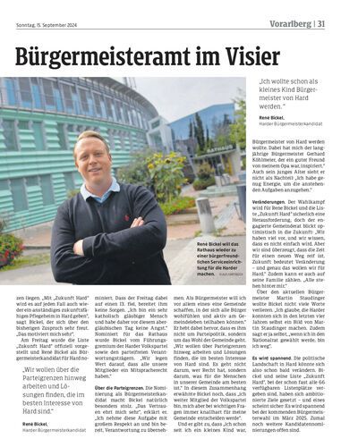 René Bickel wurde von der unabhängigen Liste „Zukunft Hard“ als Bürgermeisterkandidat nominiert. Sein Motto: „Eine Gemeinde braucht keine Parteipolitik, das Wohl der Bürger zählt.“