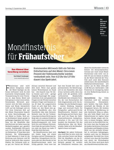 Kommenden Mittwoch fällt ein Teil des Erdschattens auf den Mond. Circa neun Prozent der Vollmondscheibe werden verdunkelt sein. Von 4.12 Uhr bis 5.17 Uhr dauert das Spektakel.