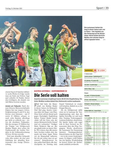 Analyse. Grün-Weiß ist vor Austrias heutigem Heimspiel gegen Kapfenberg die Modefarbe in der 2. Liga. Dieser Trend soll natürlich solange wie möglich anhalten. Die Betrachtung der Statistik in den letzten 21 Jahren belegt jedoch den schnellen möglichen „Modewechsel“.