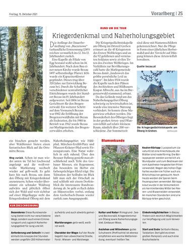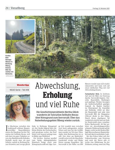 Die Geschichtenerzählerin Hertha Glück wanderte ab Talstation Seilbahn Bezau über Rimsgrund zum Seevorsäß. Über das Naherholungsgebiet Ölberg wieder zurück.