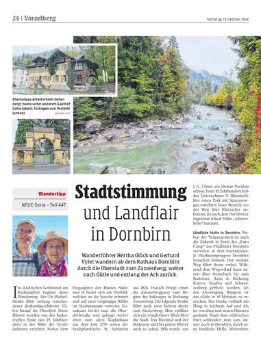 Wanderführer Hertha Glück und Gerhard Vylet wandern ab dem Rathaus Dornbirn durch die Oberstadt zum Zanzenberg, weiter nach Gütle und entlang der Ach zurück.