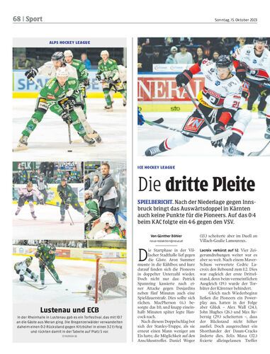 Spielbericht. Nach der Niederlage gegen Innsbruck bringt das Auswärtsdoppel in Kärnten auch keine Punkte für die Pioneers. Auf das 0:4 beim KAC folgte ein 4:6 gegen den VSV.