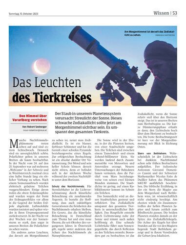 Der Staub in unserem Planetensystem verursacht Streulicht der Sonne. Dieses schwache Zodiakallicht sollte jetzt am Morgenhimmel sichtbar sein. Es umspannt den gesamten Tierkreis.