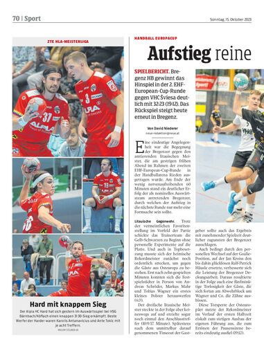 Spielbericht. Bregenz HB gewinnt das Hinspiel in der 2. EHF-European-Cup-Runde gegen VHC Šviesa deutlich mit 32:23 (19:12). Das Rückspiel steigt heute erneut in Bregenz.
