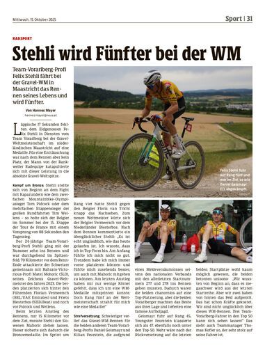 Team-Vorarlberg-Profi Felix Stehli fährt bei der Gravel-WM in Maastricht das Rennen seines Lebens und wird Fünfter.