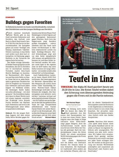 Vorschau. Der Alpla HC Hard gastiert heute um 20.20 Uhr in Linz. Die Roten Teufel wollen dabei den Schwung vom überzeugenden Heimsieg gegen die Fivers mit in die Partie nehmen.