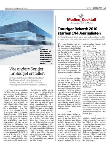Der Beruf des Journalisten war lang nicht mehr so gefährlich wie heuer./Rochaden bei der APA./Unruhe bei ORF III.