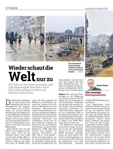 Die Stadt ist zur Ruine geworden und zum Massengrab Tausender Syrer. Das Leiden Aleppos erinnert an Sarajevo und Grosny.