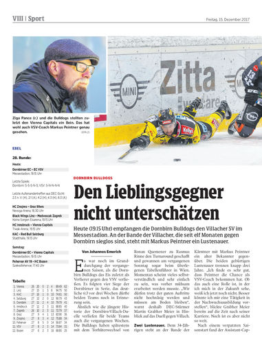Heute (19.15 Uhr) empfangen die Dornbirn Bulldogs den Villacher SV im Messestadion. An der Bande der Villacher, die seit elf Monaten gegen Dornbirn sieglos sind, steht mit Markus Peintner ein Lustenauer.