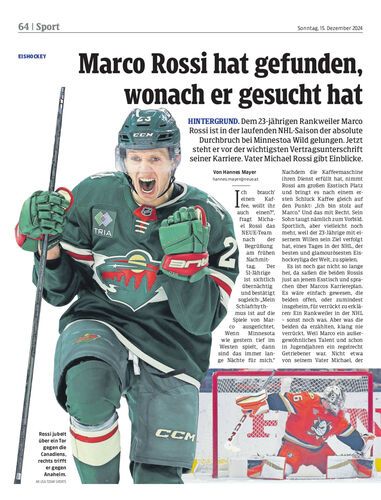 Hintergrund. Dem 23-jährigen Rankweiler Marco Rossi ist in der laufenden NHL-Saison der absolute Durchbruch bei Minnestoa Wild gelungen. Jetzt steht er vor der wichtigsten Vertragsunterschrift seiner Karriere. Vater Michael Rossi gibt Einblicke.